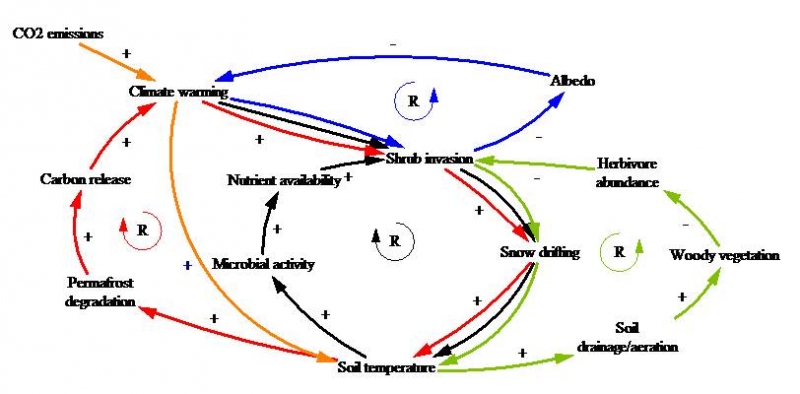 The main external driver of this regime shift is CO2 emissions that increase climate warming (IPCC 2007), leading to changes in the composition and abundance of arctic vegetation, animals and soil structure (Olofsson et al. 2009). Anthropogenic activities that elevate atmospheric greenhouse gas concentrations are generally considered to be the primary cause for this driver. Carbon release from anthropogenic sources is projected to continue and increase during the coming decades (IPCC 2007). This global driver is well established and could be looked as irreversible in the scale of next hundred years.